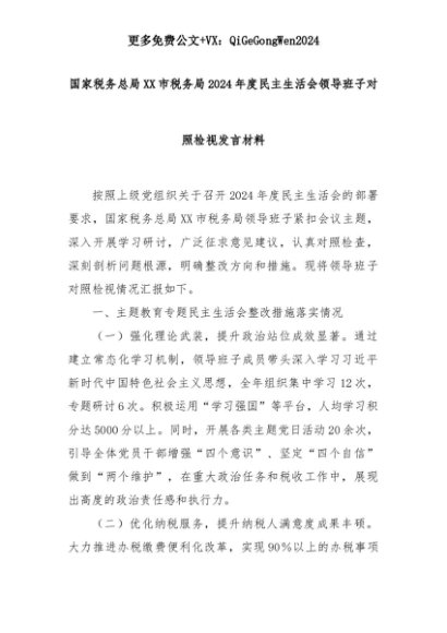 【七哥公文】2025年:国家税务总局XX市税务局2024年度民主生活会领导班子对照检视发言材料+更多免费公文+VX:QiGeGongWen2024+更多免费公文+VX:QiGeGongWen2024