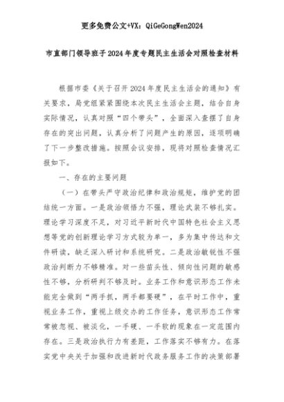 【七哥公文】2025年:市直部门领导班子2024年度专题民主生活会对照检查材料+更多免费公文+VX:QiGeGongWen2024+更多免费公文+VX:QiGeGongWen2024