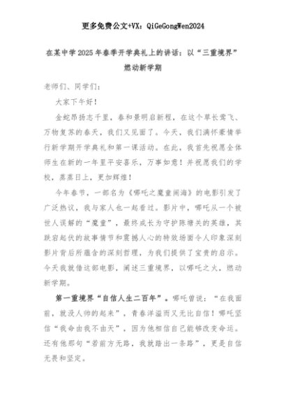 【七哥公文】2025年:在某中学2025年春季开学典礼上的讲话:以“三重境界”燃动新学期+更多免费公文+VX:QiGeGongWen2024+更多免费公文+VX:QiGeGongWen2024
