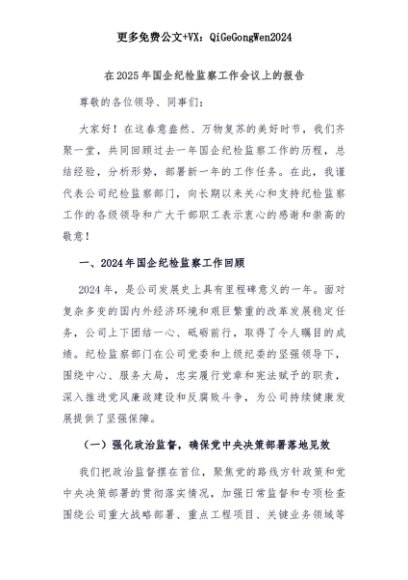 【七哥公文】2025年:在2025年国企纪检监察工作会议上的报告+更多免费公文+VX:QiGeGongWen2024+更多免费公文+VX:QiGeGongWen2024