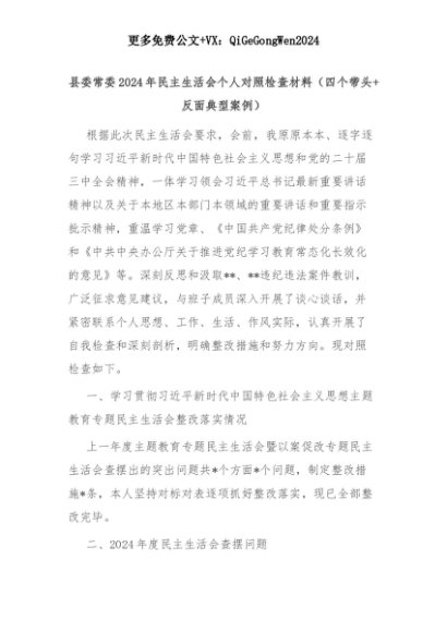【七哥公文】2025年:县委常委2024年民主生活会个人对照检查材料(四个带头+反面典型案例)+更多免费公文+VX:QiGeGongWen2024+更多免费公文+VX:QiGeGongWen2024
