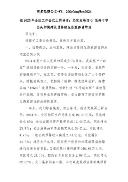 【七哥公文】2025年:在2025年全区工作会议上的讲话:坚定发展信心 坚持干字当头加快建设世界级生态旅游目的地+更多免费公文+VX:QiGeGongWen2024+更多免费公文+VX:QiGeGongWen2024