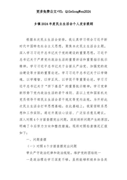 【七哥公文】2025年:乡镇2024年度民主生活会个人发言提纲+更多免费公文+VX:QiGeGongWen2024+更多免费公文+VX:QiGeGongWen2024