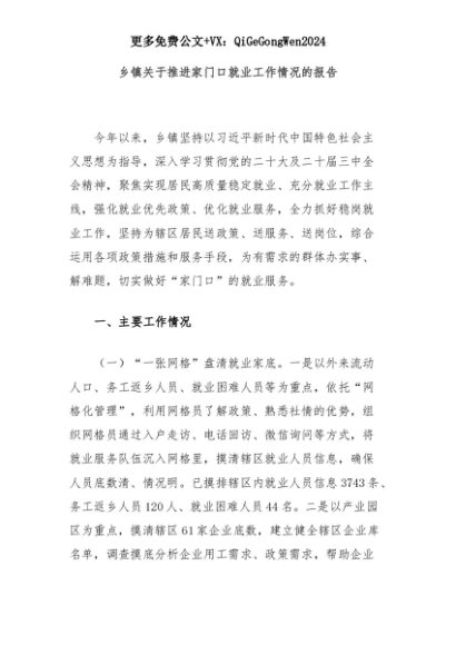 【七哥公文】2025年:乡镇关于推进家门口就业工作情况的报告+更多免费公文+VX:QiGeGongWen2024+更多免费公文+VX:QiGeGongWen2024