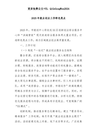 【七哥公文】2025年:2025年就业创业工作特色亮点+更多免费公文+VX:QiGeGongWen2024+更多免费公文+VX:QiGeGongWen2024