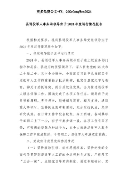 【七哥公文】2025年:县退役军人事务局领导班子2024年度运行情况报告+更多免费公文+VX:QiGeGongWen2024+更多免费公文+VX:QiGeGongWen2024