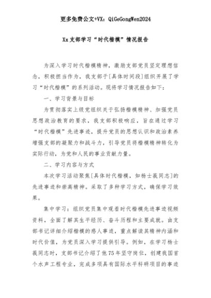 【七哥公文】2025年:Xx支部学习“时代楷模”情况报告+更多免费公文+VX:QiGeGongWen2024+更多免费公文+VX:QiGeGongWen2024