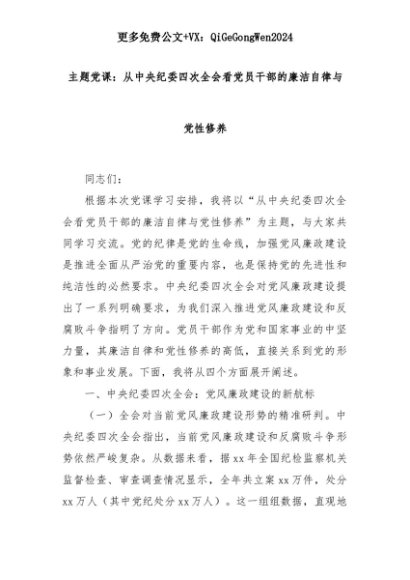 【七哥公文】2025年:主题党课:从中央纪委四次全会看党员干部的廉洁自律与党性修养+更多免费公文+VX:QiGeGongWen2024+更多免费公文+VX:QiGeGongWen2024