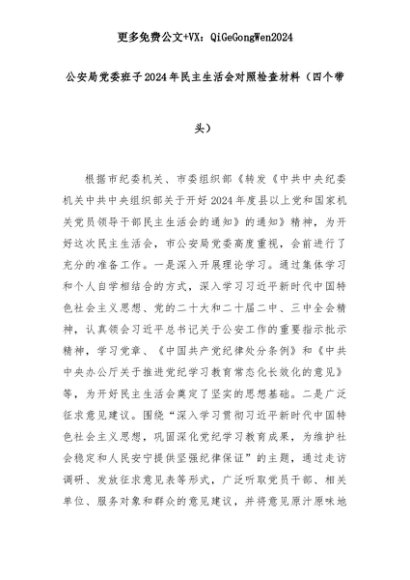 【七哥公文】2025年:公安局党委班子2024年民主生活会对照检查材料(四个带头)+更多免费公文+VX:QiGeGongWen2024+更多免费公文+VX:QiGeGongWen2024