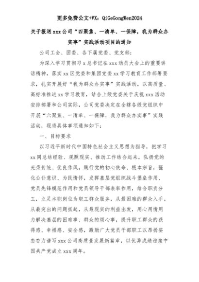 【七哥公文】2025年:关于报送xxx公司“四聚焦、一清单、一保障,我为群众办实事”实践活动项目的通知+更多免费公文+VX:QiGeGongWen2024+更多免费公文+VX:QiGeGongWen2024