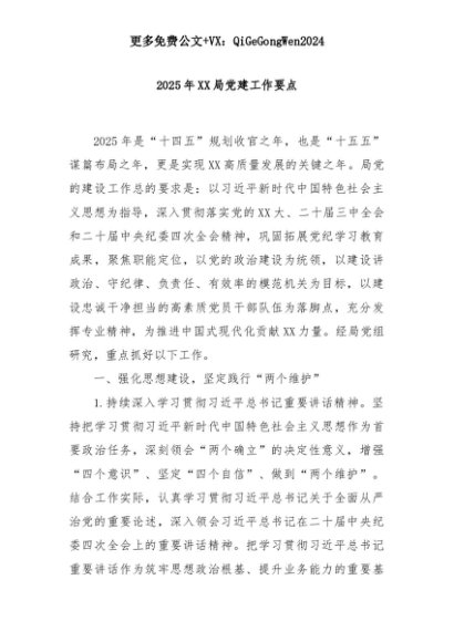 【七哥公文】2025年:2025年XX局党建工作要点+更多免费公文+VX:QiGeGongWen2024+更多免费公文+VX:QiGeGongWen2024