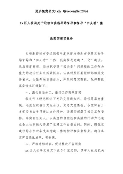 【七哥公文】2025年:Xx区人社局关于迎接市委指导站督导和督导“回头看”整改落实情况报告+更多免费公文+VX:QiGeGongWen2024+更多免费公文+VX:QiGeGongWen2024