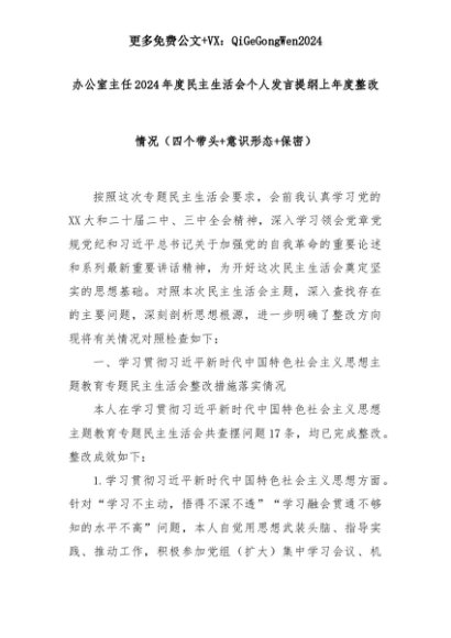 【七哥公文】2025年:办公室主任2024年度民主生活会个人发言提纲上年度整改情况(四个带头+意识形态+保密)+更多免费公文+VX:QiGeGongWen2024+更多免费公文+VX:QiGeGongWen2024