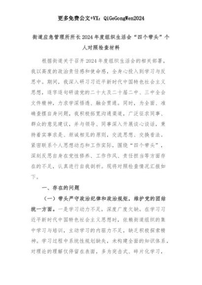 【七哥公文】2025年:街道应急管理所所长2024年度组织生活会“四个带头”个人对照检查材料+更多免费公文+VX:QiGeGongWen2024+更多免费公文+VX:QiGeGongWen2024