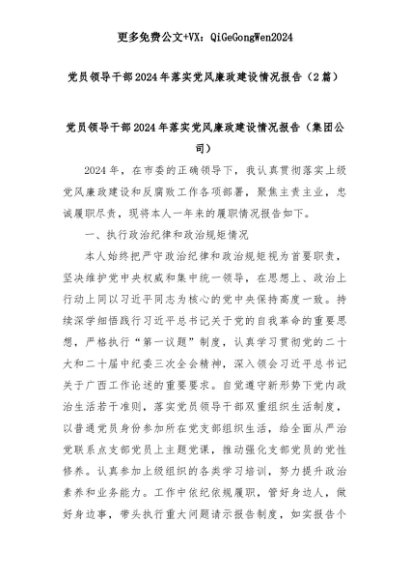 【七哥公文】2025年:(2篇)党员领导干部2024年落实党风廉政建设情况报告+更多免费公文+VX:QiGeGongWen2024+更多免费公文+VX:QiGeGongWen2024