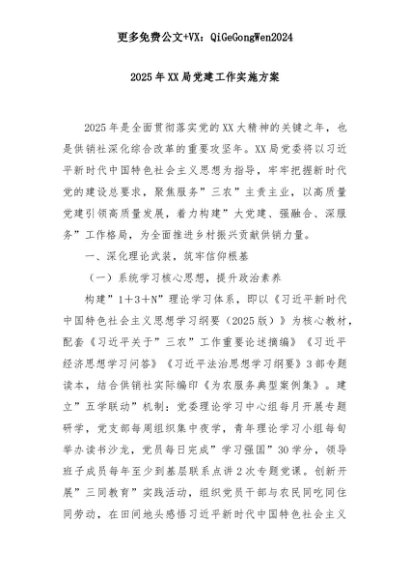 【七哥公文】2025年:2025年XX局党建工作实施方案+更多免费公文+VX:QiGeGongWen2024+更多免费公文+VX:QiGeGongWen2024
