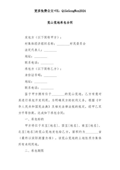 【七哥公文】2025年:荒山荒地承包合同+更多免费公文+VX:QiGeGongWen2024+更多免费公文+VX:QiGeGongWen2024