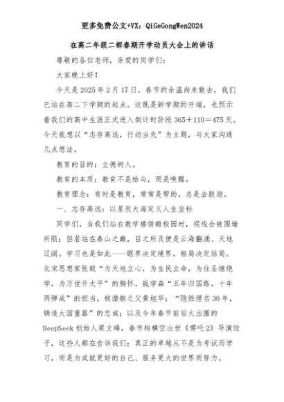 【七哥公文】2025年:在高二年级二部春期开学动员大会上的讲话+更多免费公文+VX:QiGeGongWen2024+更多免费公文+VX:QiGeGongWen2024