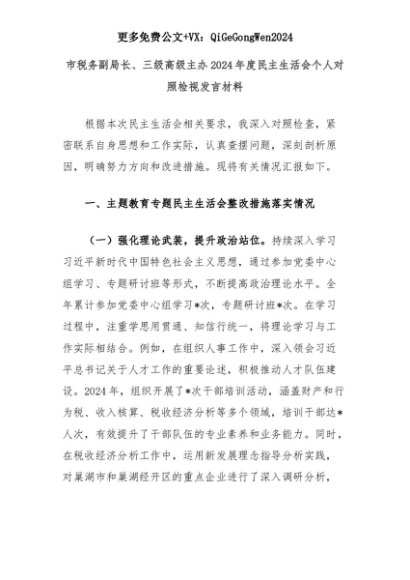 【七哥公文】2025年:市税务副局长、三级高级主办2024年度民主生活会个人对照检视发言材料+更多免费公文+VX:QiGeGongWen2024+更多免费公文+VX:QiGeGongWen2024