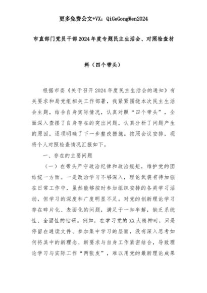 【七哥公文】2025年:市直部门党员干部2024年度专题民主生活会、对照检查材料(四个带头)+更多免费公文+VX:QiGeGongWen2024+更多免费公文+VX:QiGeGongWen2024