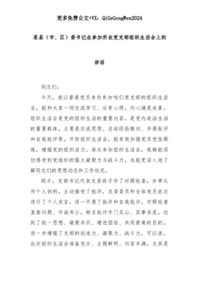 【七哥公文】2025年:某县(市、区)委书记在参加所在党支部组织生活会上的讲话+更多免费公文+VX:QiGeGongWen2024+更多免费公文+VX:QiGeGongWen2024
