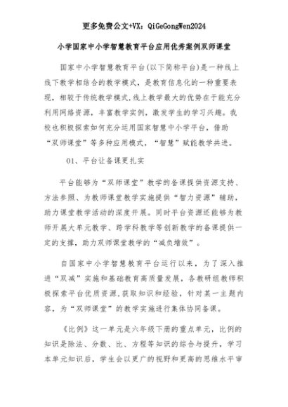 【七哥公文】2025年:小学国家中小学智慧教育平台应用优秀案例双师课堂+更多免费公文+VX:QiGeGongWen2024+更多免费公文+VX:QiGeGongWen2024