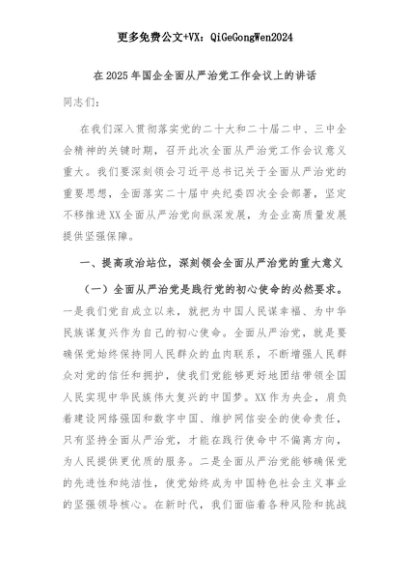 【七哥公文】2025年:在2025年国企全面从严治党工作会议上的讲话+更多免费公文+VX:QiGeGongWen2024+更多免费公文+VX:QiGeGongWen2024