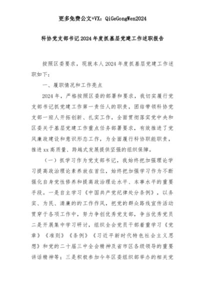 【七哥公文】2025年:科协党支部书记2024年度抓基层党建工作述职报告+更多免费公文+VX:QiGeGongWen2024+更多免费公文+VX:QiGeGongWen2024
