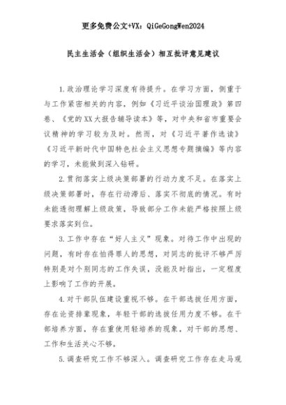 【七哥公文】2025年:民主生活会(组织生活会)相互批评意见建议+更多免费公文+VX:QiGeGongWen2024+更多免费公文+VX:QiGeGongWen2024