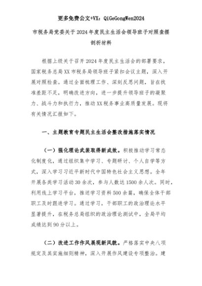 【七哥公文】2025年:市税务局党委关于2024年度民主生活会领导班子对照查摆剖析材料+更多免费公文+VX:QiGeGongWen2024+更多免费公文+VX:QiGeGongWen2024