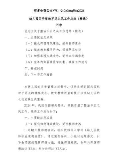 【七哥公文】2025年:幼儿园关于整治不正之风工作总结(精选)+更多免费公文+VX:QiGeGongWen2024+更多免费公文+VX:QiGeGongWen2024
