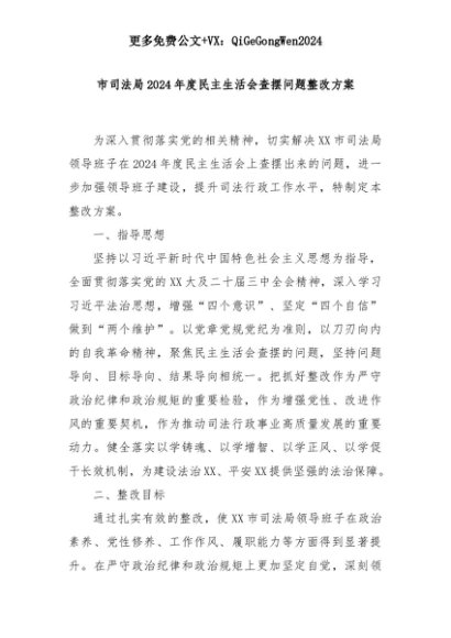 【七哥公文】2025年:市司法局2024年度民主生活会查摆问题整改方案+更多免费公文+VX:QiGeGongWen2024+更多免费公文+VX:QiGeGongWen2024