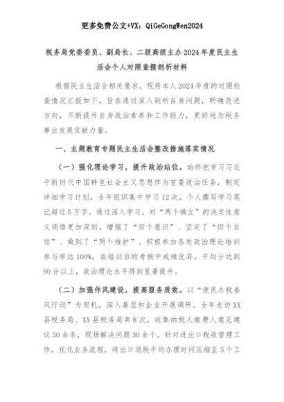 【七哥公文】2025年:税务局党委委员、副局长、二级高级主办2024年度民主生活会个人对照查摆剖析材料+更多免费公文+VX:QiGeGongWen2024+更多免费公文+VX:QiGeGongWen2024