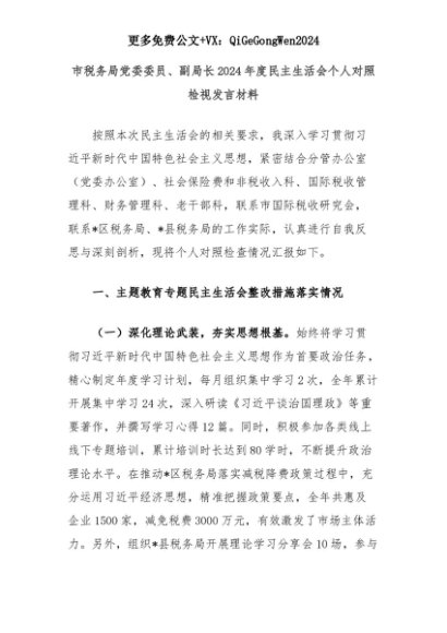 【七哥公文】2025年:市税务局党委委员、副局长2024年度民主生活会个人对照检视发言材料+更多免费公文+VX:QiGeGongWen2024+更多免费公文+VX:QiGeGongWen2024