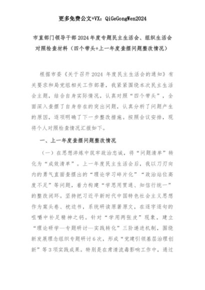 【七哥公文】2025年:市直部门领导干部2024年度专题民主生活会、组织生活会对照检查材料(四个带头+上一年度查摆问题整改情况)+更多免费公文+VX:QiGeGongWen2024+更多免费公文+VX:QiGeGongWen2024