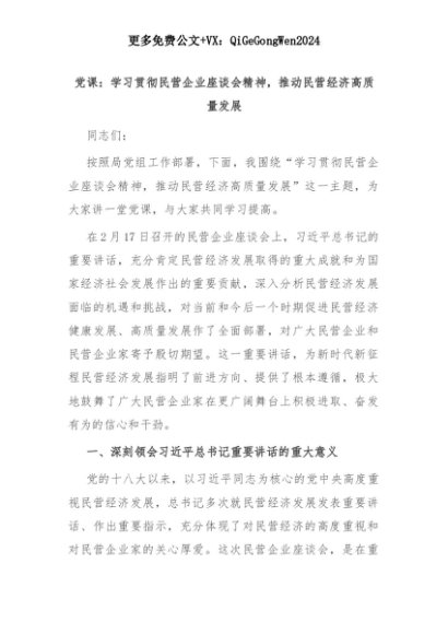 【七哥公文】2025年:党课:学习贯彻民营企业座谈会精神,推动民营经济高质量发展+更多免费公文+VX:QiGeGongWen2024+更多免费公文+VX:QiGeGongWen2024