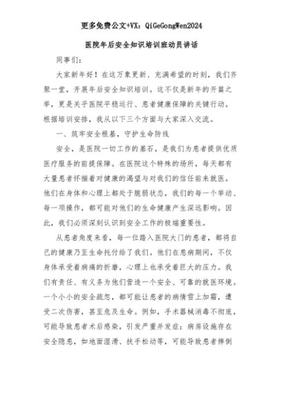 【七哥公文】2025年:医院年后安全知识培训班动员讲话+更多免费公文+VX:QiGeGongWen2024+更多免费公文+VX:QiGeGongWen2024