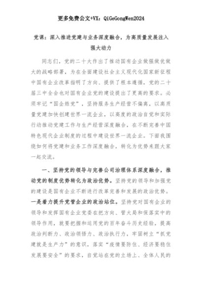 【七哥公文】2025年:党课:深入推进党建与业务深度融合,为高质量发展注入强大动力+更多免费公文+VX:QiGeGongWen2024+更多免费公文+VX:QiGeGongWen2024