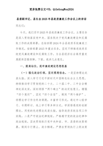 【七哥公文】2025年:县委副书记、县长在2025年县政府廉政工作会议上的讲话+更多免费公文+VX:QiGeGongWen2024+更多免费公文+VX:QiGeGongWen2024