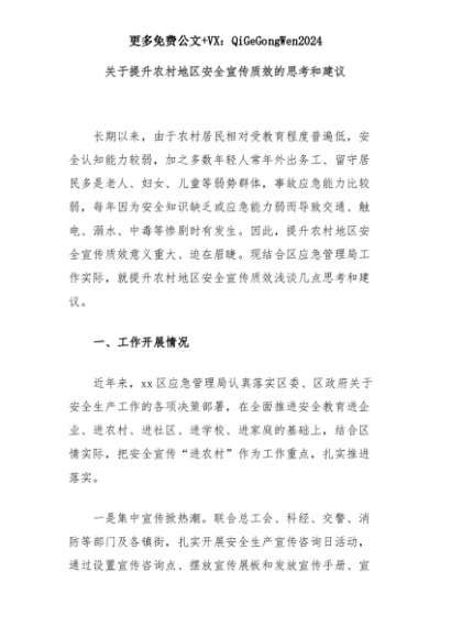 【七哥公文】2025年:关于提升农村地区安全宣传质效的思考和建议+更多免费公文+VX:QiGeGongWen2024+更多免费公文+VX:QiGeGongWen2024