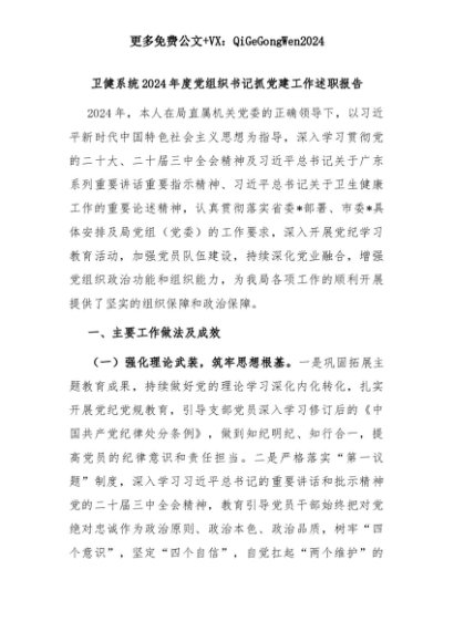 【七哥公文】2025年:卫健系统2024年度党组织书记抓党建工作述职报告+更多免费公文+VX:QiGeGongWen2024+更多免费公文+VX:QiGeGongWen2024