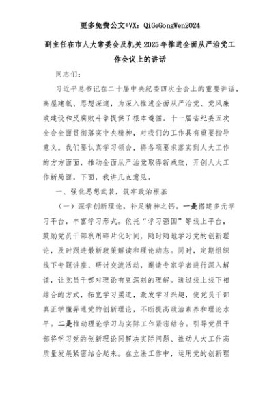 【七哥公文】2025年:副主任在市人大常委会及机关2025年推进全面从严治党工作会议上的讲话+更多免费公文+VX:QiGeGongWen2024+更多免费公文+VX:QiGeGongWen2024