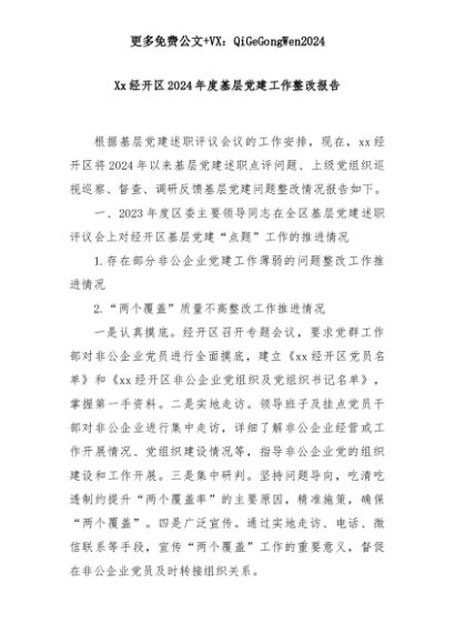 【七哥公文】2025年:Xx经开区2024年度基层党建工作整改报告+更多免费公文+VX:QiGeGongWen2024+更多免费公文+VX:QiGeGongWen2024