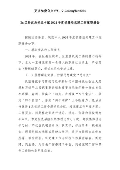 【七哥公文】2025年:Xx区科技局党组书记2024年度抓基层党建工作述职报告+更多免费公文+VX:QiGeGongWen2024+更多免费公文+VX:QiGeGongWen2024