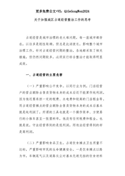 【七哥公文】2025年:关于加强城区占道经营整治工作的思考+更多免费公文+VX:QiGeGongWen2024+更多免费公文+VX:QiGeGongWen2024