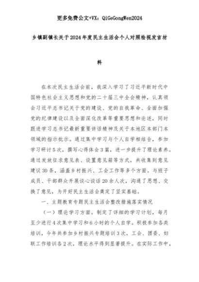 【七哥公文】2025年:乡镇副镇长关于2024年度民主生活会个人对照检视发言材料+更多免费公文+VX:QiGeGongWen2024+更多免费公文+VX:QiGeGongWen2024