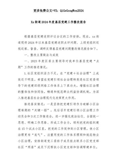 【七哥公文】2025年:Xx街道2024年度基层党建工作整改报告+更多免费公文+VX:QiGeGongWen2024+更多免费公文+VX:QiGeGongWen2024