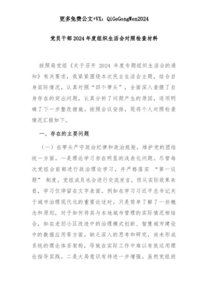 【七哥公文】2025年:党员干部2024年度组织生活会对照检查材料+更多免费公文+VX:QiGeGongWen2024+更多免费公文+VX:QiGeGongWen2024