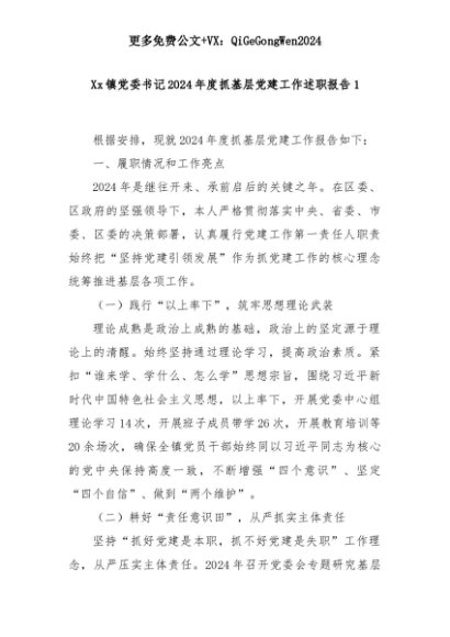 【七哥公文】2025年:Xx镇党委书记2024年度抓基层党建工作述职报告1+更多免费公文+VX:QiGeGongWen2024+更多免费公文+VX:QiGeGongWen2024