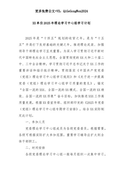 【七哥公文】2025年:XX单位2025年理论学习中心组学习计划+更多免费公文+VX:QiGeGongWen2024+更多免费公文+VX:QiGeGongWen2024